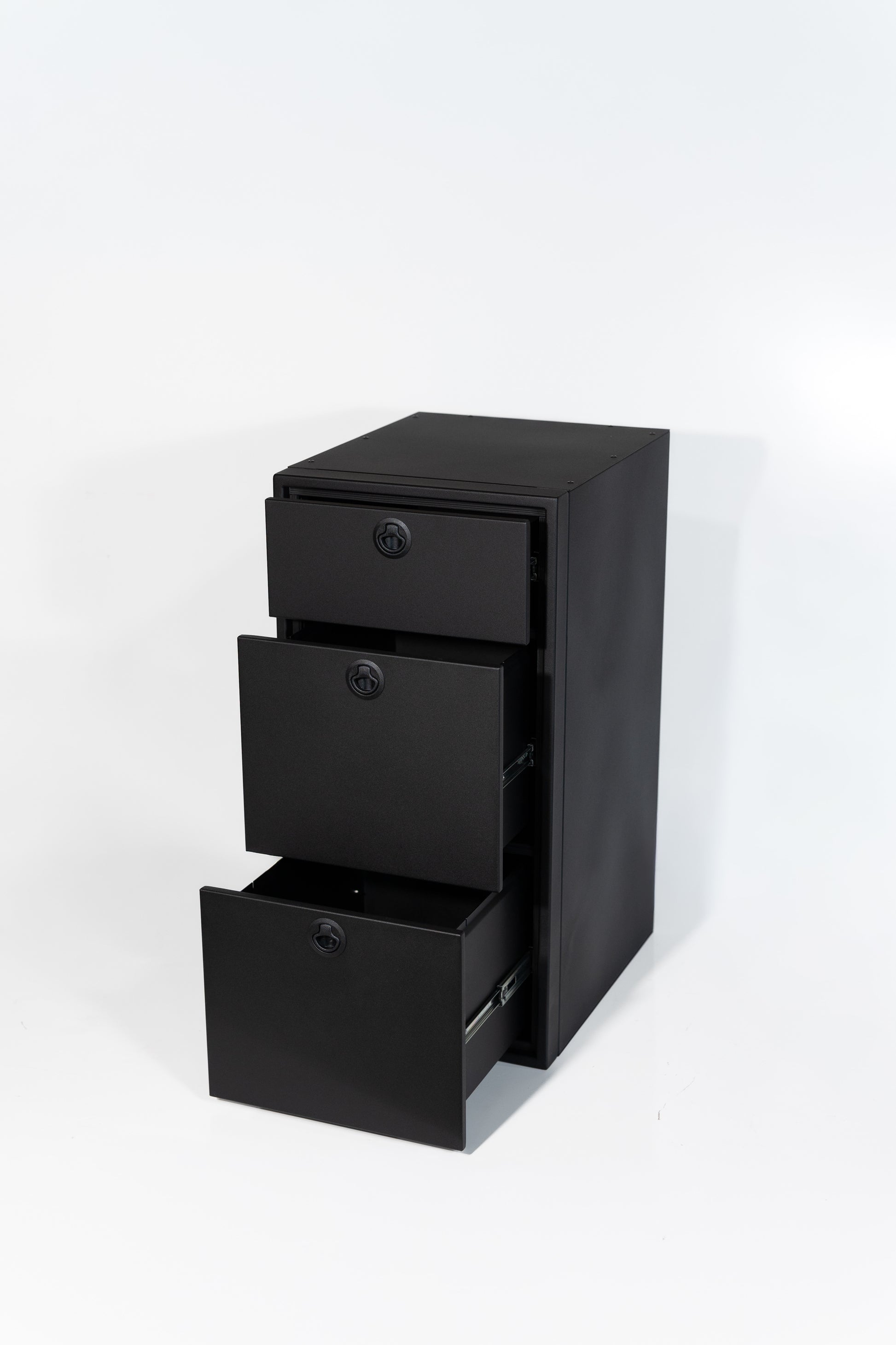 Powder coated aluminum base cabinet features three soft close full box construction drawers. Fully finished cabinet includes base, 4 sides, and top. Customer can add own countertop to finish the look of this cabinet.