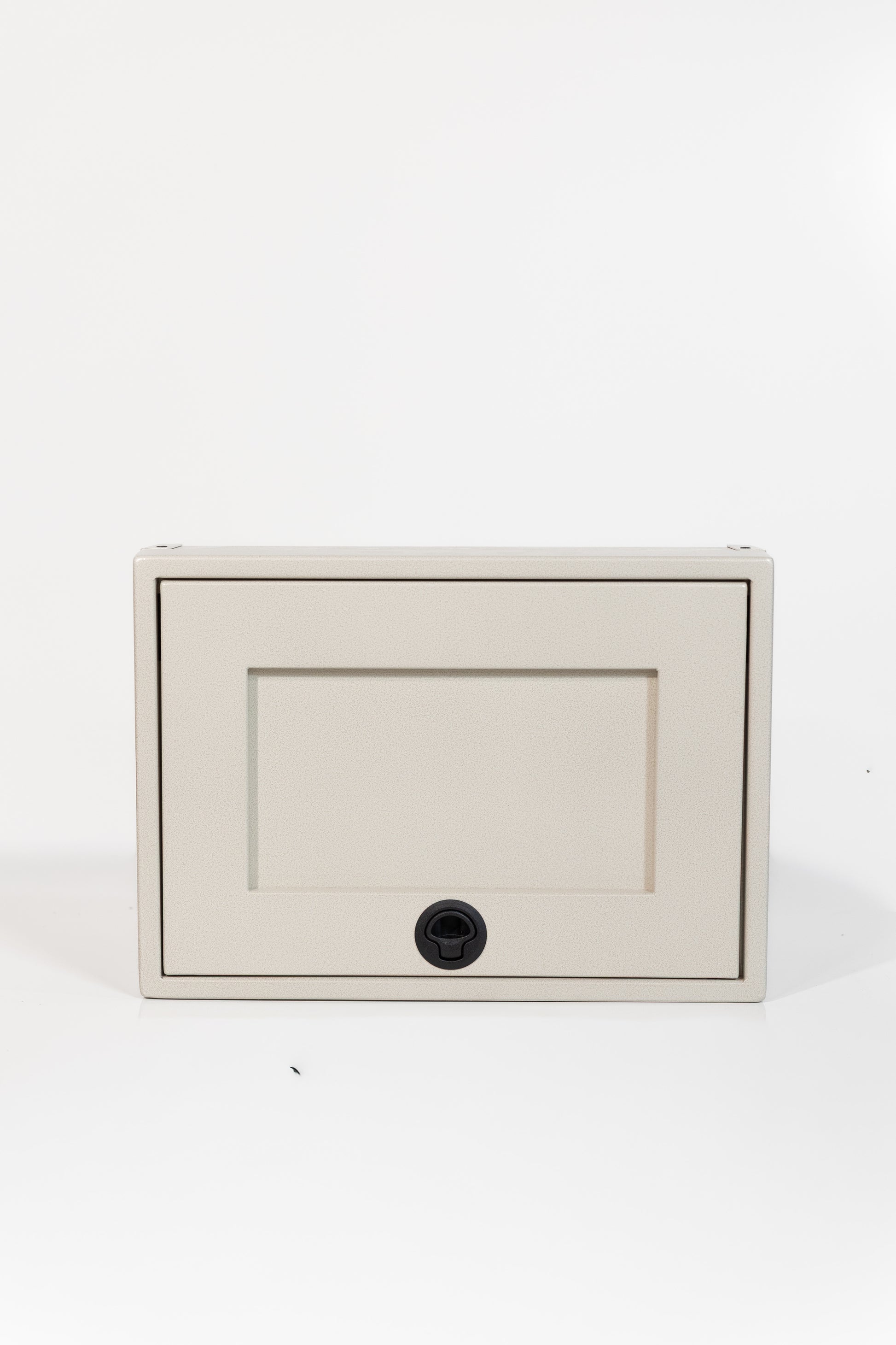 Powder coated aluminum cabinet with fully enclosed top, bottom, and rear. Angles will allow cabinet to fit in a Sprinter, Transit, and Promaster.