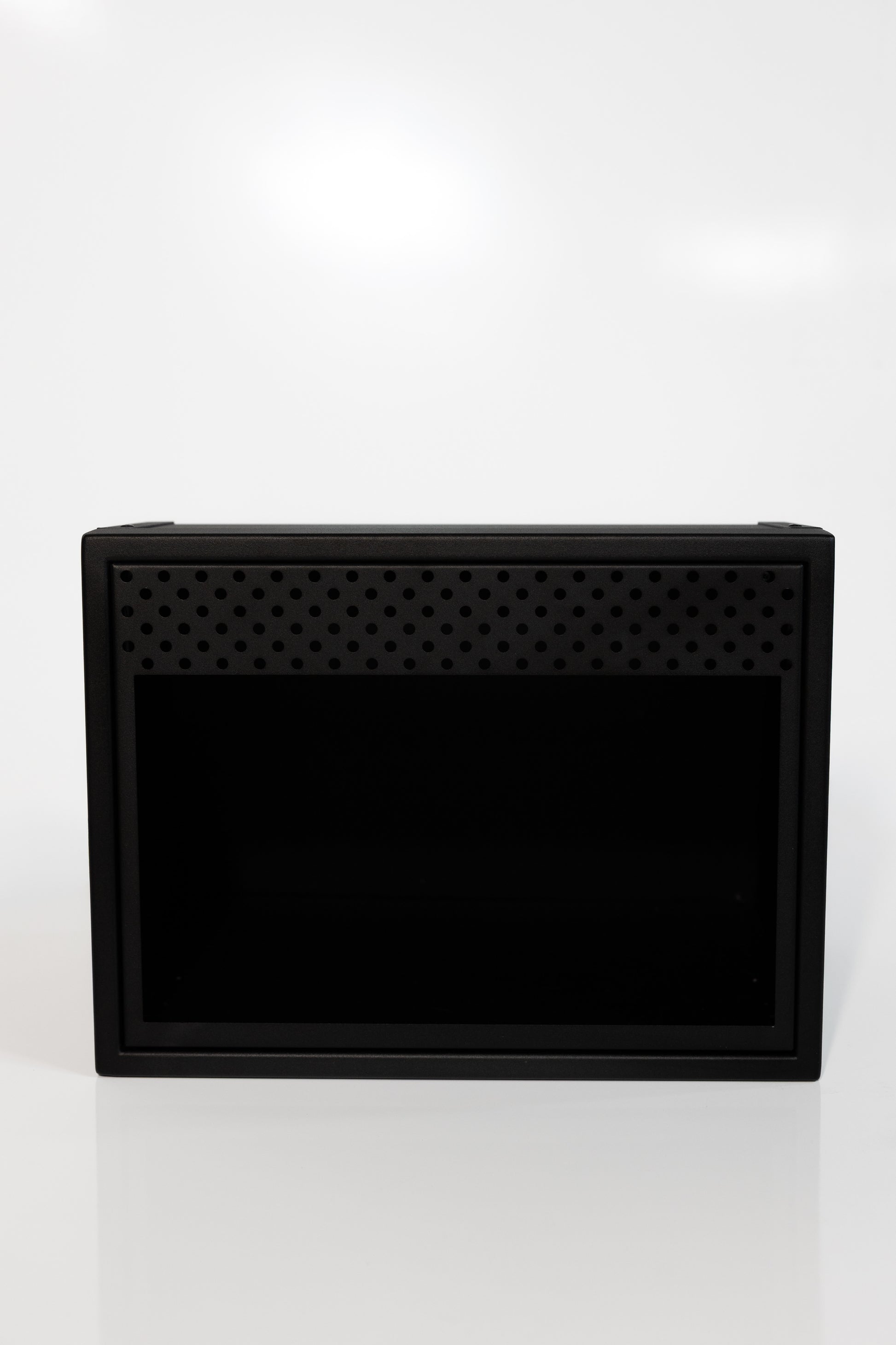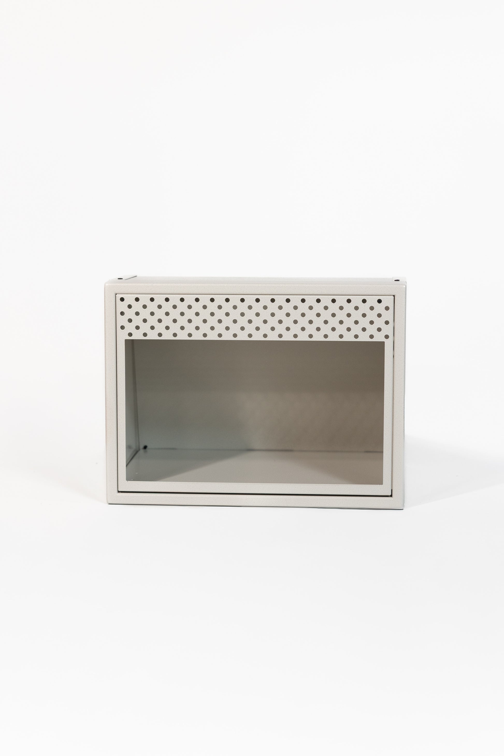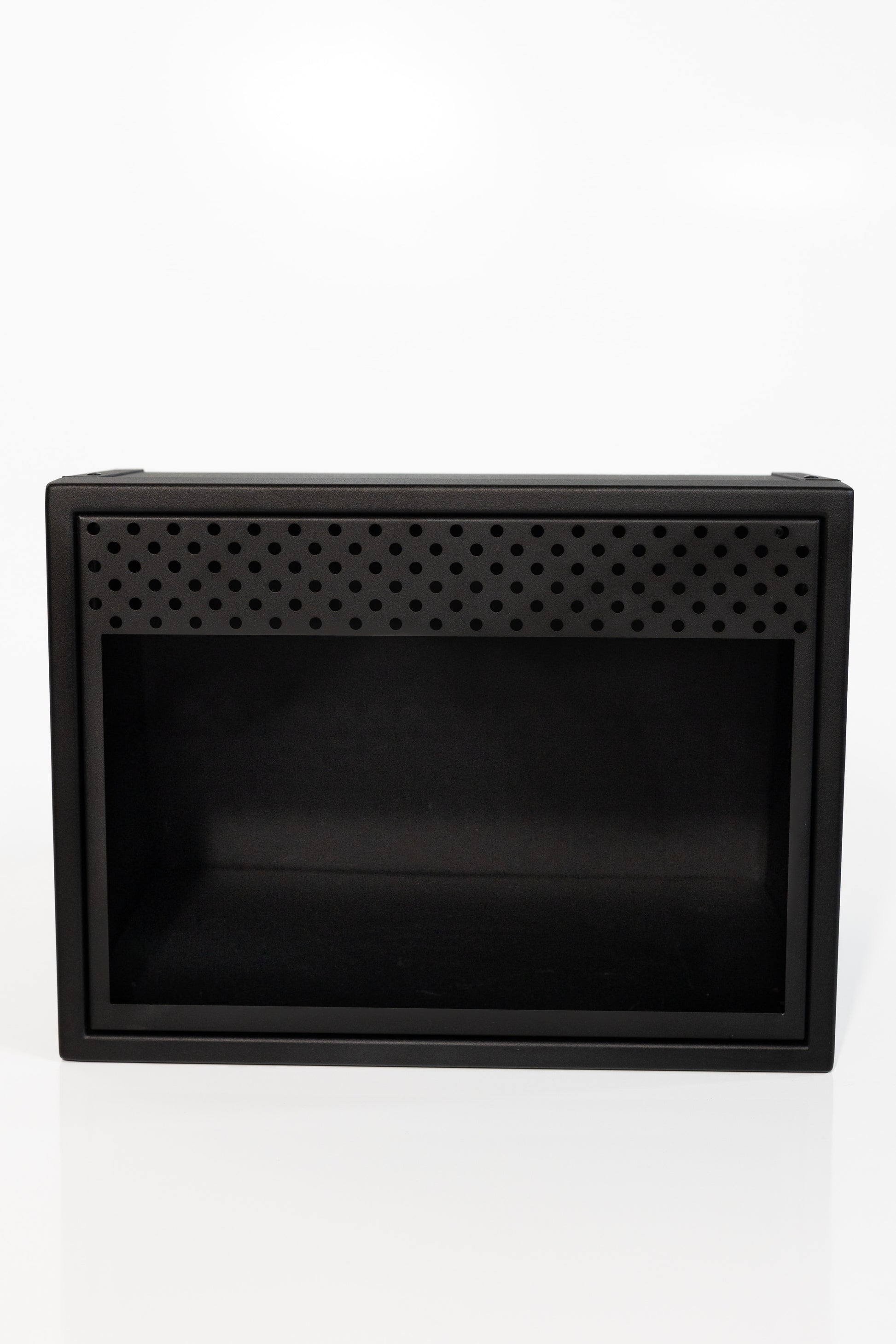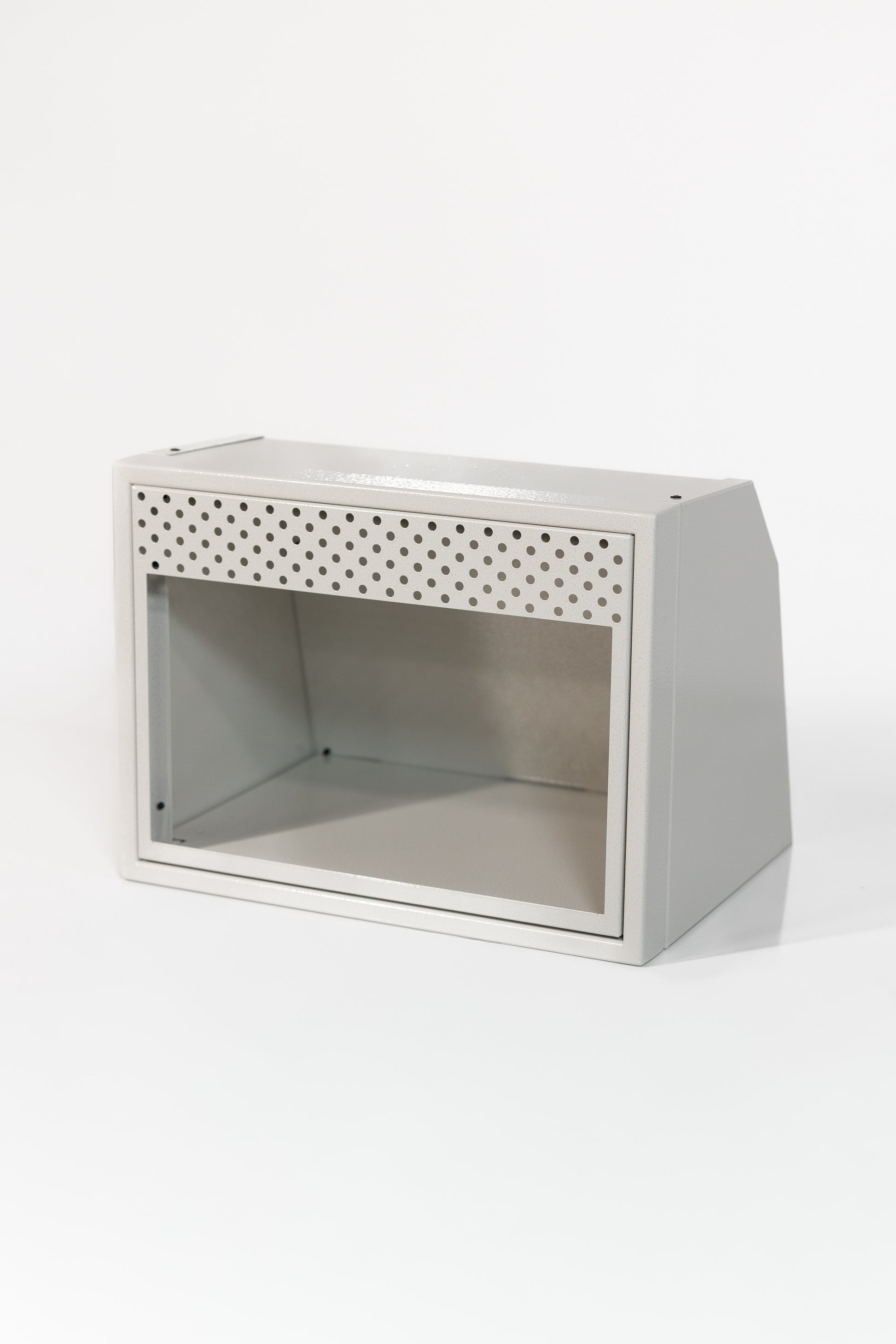 Powder coated aluminum cabinet with fully enclosed top, bottom, and rear. Angles will allow cabinet to fit in a Sprinter, Transit, and Promaster.