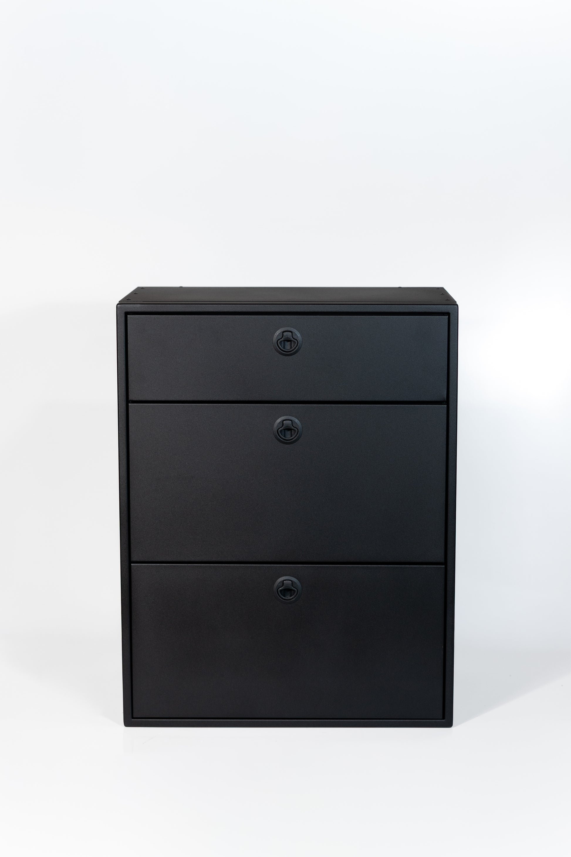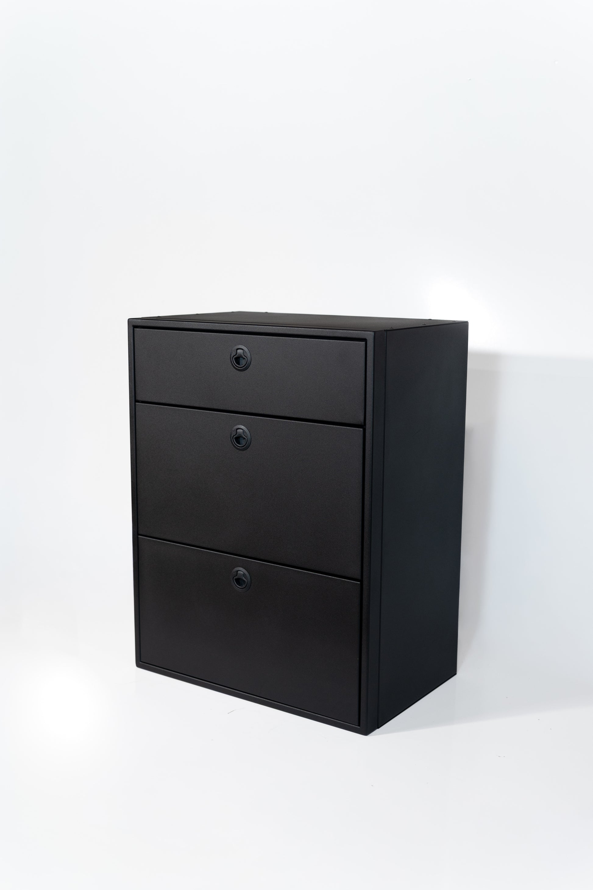 - Powder coated aluminum base cabinet features three soft close full box construction drawers.